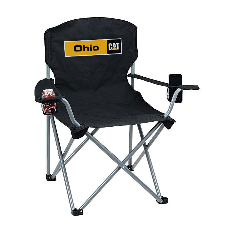 The Ohio Cat Logo Black Folding Chair offers heavy-duty support with a capacity of up to 500 lbs. Featuring two mesh cup holders, it provides convenient drink storage right at your fingertips. The chair proudly displays the Ohio Cat logo on the back, combining functionality with the brand you love. Its robust yet foldable design ensures easy transport and storage for professionals on the go.