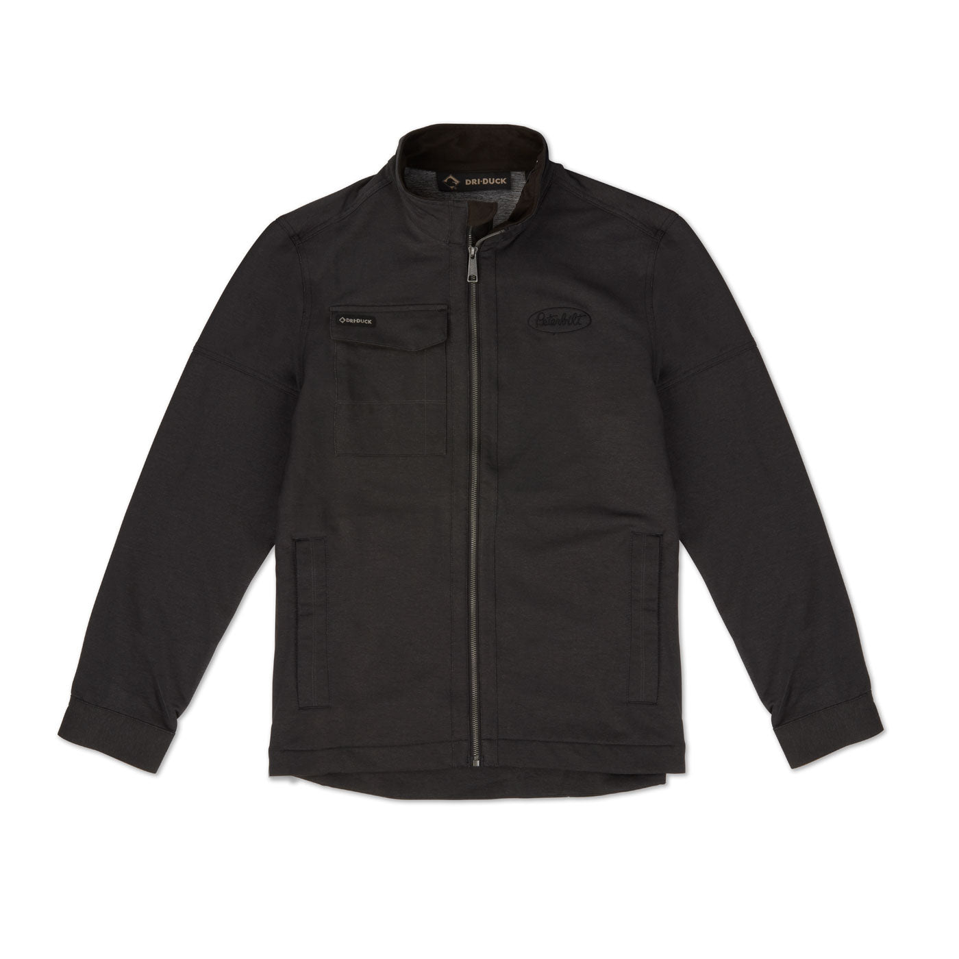 Work-ready softshell is infused with spandex to provide water-resistant warmth that follows your every move. Features a snap chest pocket, snap hand pockets, adjustable gussetted cuffs, and a slight droptail waist. • Color: Charcoal • Decoration: Embroidered Peterbilt Oval • Material: Nylon/polyester
